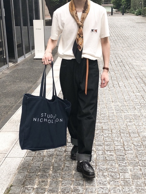 メゾンキツネの定番モデルの中で、最も人気の高い「Double Fox Head」のパッチが付いたTシャツを着用したきれいめカジュアルスタイル。ゆったりめのきれいなシルエットのブラックデニムパンツとスカーフで、品のある着こなしに仕上がっています。ベルトもこなれ感のあるアクセントに。