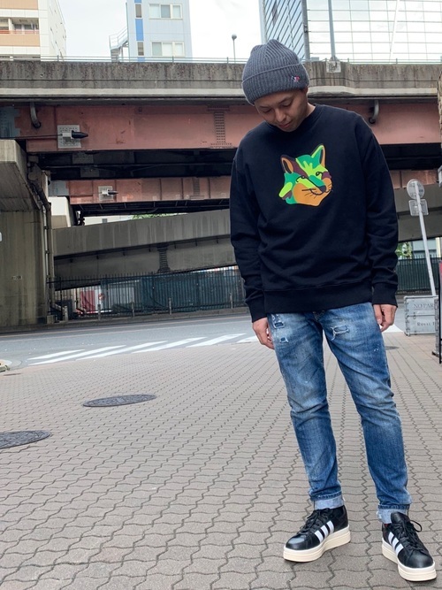 ここからは、メゾンキツネのアイテムを着用した秋冬のメンズコーデ集を紹介します。スウェットやニット、パーカー、ジャケットなど、幅広いメゾンキツネのアイテムの着こなしをチェックしましょう。