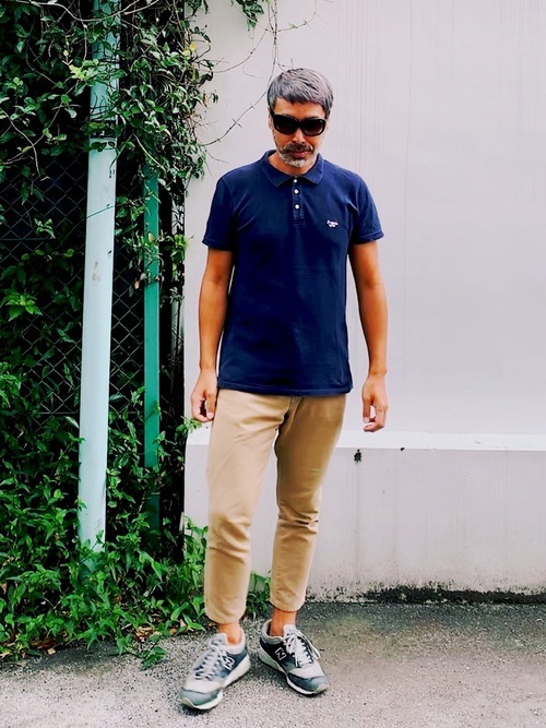 メゾンキツネのネイビーのポロシャツとベージュのチノパンをさらりと着こなしたメンズコーデです。襟元のデザインに品を感じさせるポロシャツと細身のチノパンですっきりとしたシルエットの上品なカジュアルスタイルに仕上がっています。ボリュームのあるスニーカーが好バランスです。
