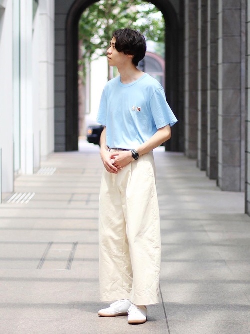 メゾンキツネの「Double Fox Head」のライトブルーのTシャツを使用したメンズコーデです。ライトブルーと白のさわやかな配色の組み合わせを、タックインで着ることによってメリハリが生まれています。カーキのG-SHOCKがアクセントに。リラックス感のあるビッグシルエットでトレンド感のある着こなしに仕上がっています。