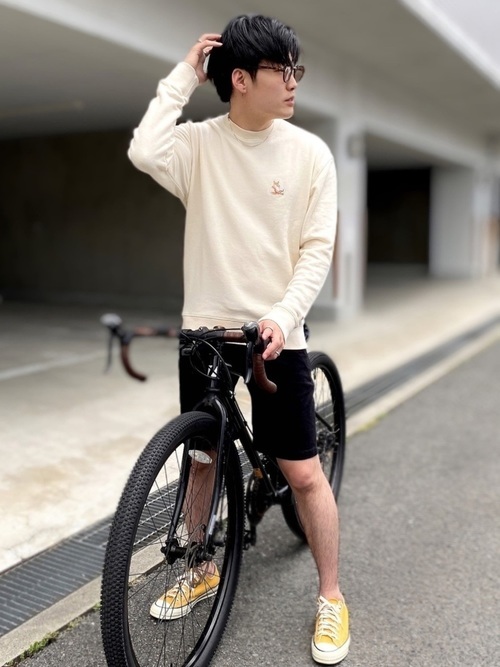 リラックスムードの「Chillax Fox」をあしらったメゾンキツネのスウェットを着用したメンズコーデです。黒のショートパンツとCONVERSEのイエローのスニーカーで、春らしい軽快さを感じさせる着こなしになっています。