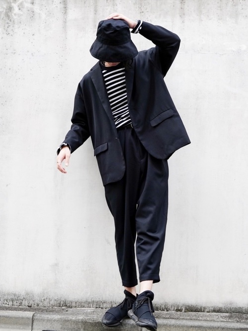 メゾンキツネのボーダーTシャツを使用したメンズコーデ。オーバーサイズのセットアップとバケットハットで旬のシルエットに。シックなブラックコーデにボーダーTシャツとすっきりとした丈感のパンツが抜け感をもたらしています。