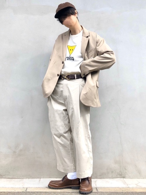 白とベージュのリラックス感のあるコーデに、遊び心のある「Triangle Fox」ロゴTシャツが独特の存在感を放つきれいめカジュアルスタイルです。ゆったりとしたシルエットが旬のムードを演出しています。小物はブラウンでまとめて、統一感とこなれ感のある着こなしに仕上がっています。