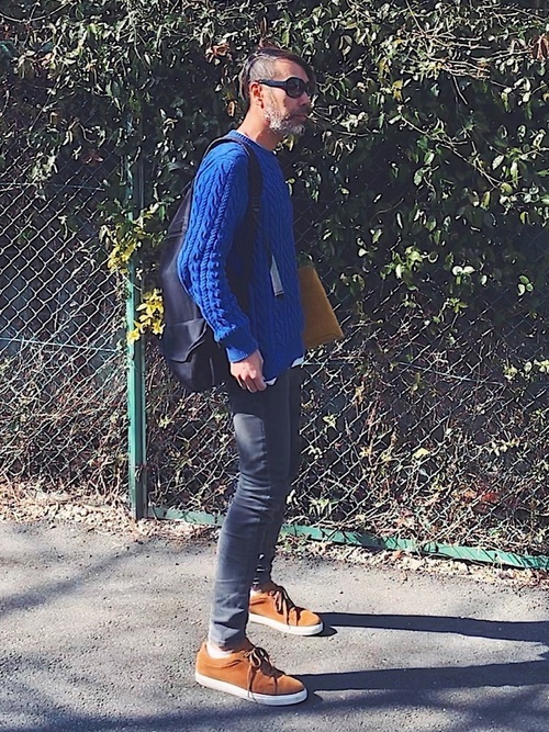 鮮やかなブルーのメゾンキツネのニットを着用したメンズコーデです。黒のスキニーデニムとブラウンのスニーカーを合わせて、ブルーのニットが引き立つ軽快でスタイリッシュな着こなしになっています。バックパックやサングラスもバランスアップに効果的です。
