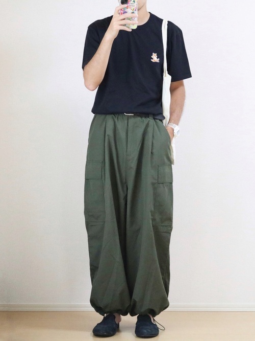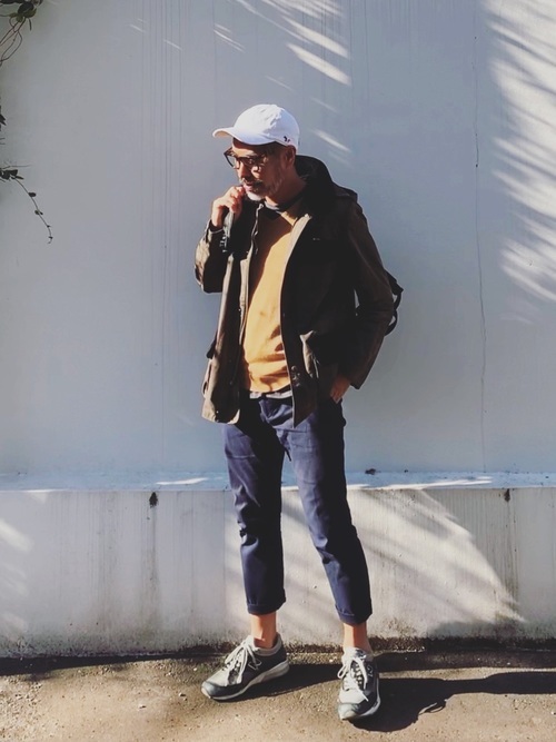 メゾンキツネのミリタリーパーカージャケットとキャップを使用したコーデです。ゆったりとしたシルエットのパーカージャケットと、すっきりとしたパンツ、ボリュームのあるスニーカーのバランスがよく、洗練された大人のカジュアルスタイルになっています。トリコロールのキツネのパッチがアクセントのキャップは、シンプルで初心者の方も取り入れやすそうです。