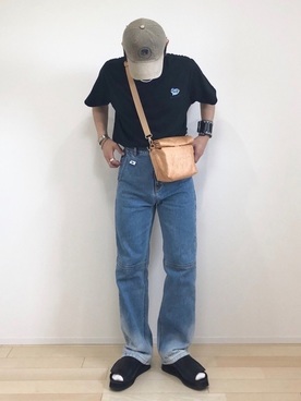 メゾンキツネと韓国ブランド「ADER ERROR(アーダーエラー)」のコラボアイテムのTシャツ、デニムパンツ、キャップを使用したコーデです。裾部分のウォッシュ加工が印象的なデニムパンツは、フロントポケット部分のブランドオリジナルのタグがさりげないアクセントに。小物使いや落ち着いた配色で、都会的な大人のカジュアルスタイルになっています。