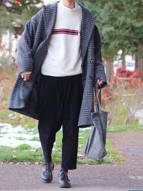 白スウェット×チェックコート×黒ワイドパンツ