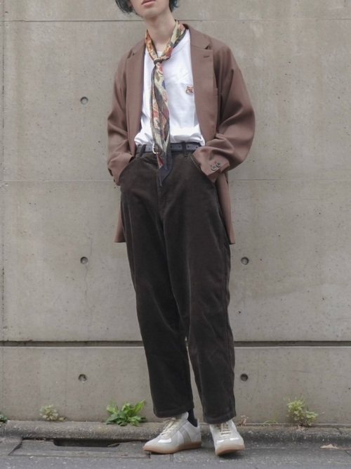 メゾンキツネの白Tシャツをレイヤードしたブラウンコーデです。ちらりと見えるFOX HEADパッチがさりげないアクセントになっています。ジャケットとパンツの色味や素材が異なるブラウンで、奥行きを感じさせる洗練された着こなしに。フラワープリントのスカーフとオーバーサイズのシルエットが、リラックスムードを演出しています。