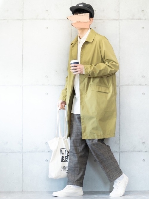 カーキコート×黒スラックス×白スニーカー