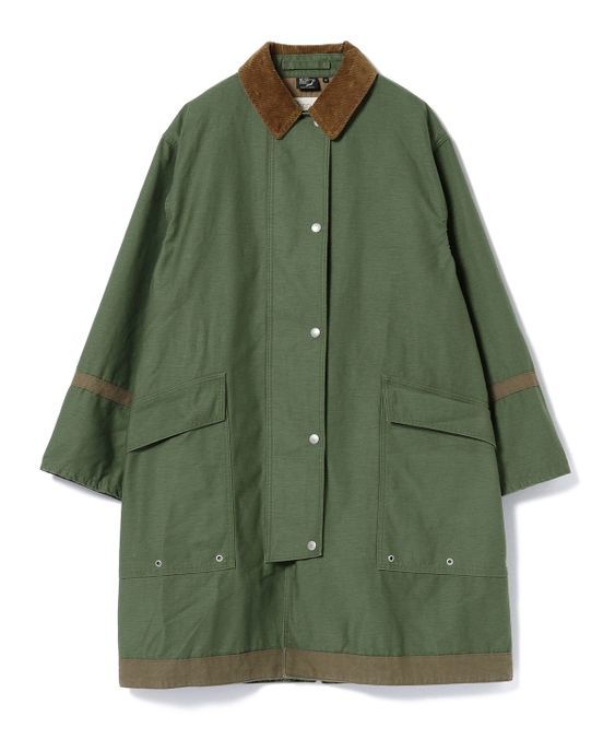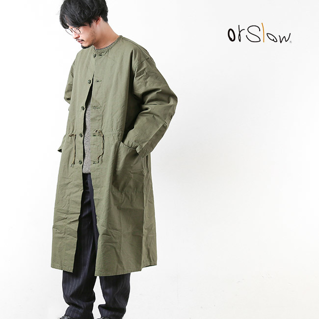 シンプルなデザインのノーカラーコートになります。ミリタリーアイテムで知られるガスプロテクティブコートをモチーフにしたということで、ボタンを閉じて着ればミリタリー調な着こなしに、インナーにフード付きパーカーを着ればカジュアルな着こなしに仕上がりますよ。シンプルながらも、随所に職人の加工技術の高さが見られる1着です。