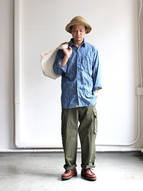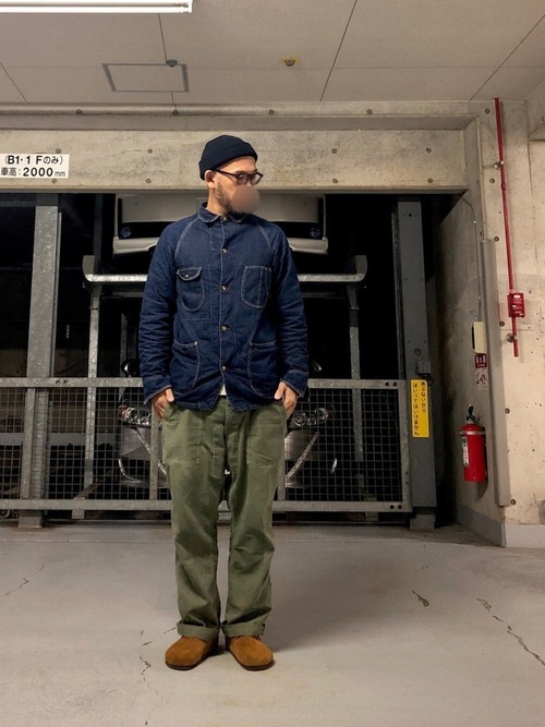 ワイドシルエットが魅力のオアスロウ製ファティーグパンツに、シンプルなデザインのスイングトップを組み合わせたコーデになります。インナーのニットをタックインさせているのが、着こなしのポイントですね。ヴィンテージ加工されたパンツが、いい風合いを出しているのが分かります。