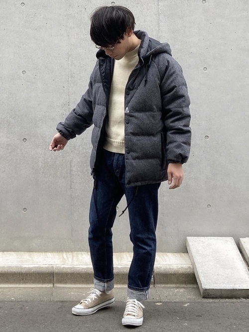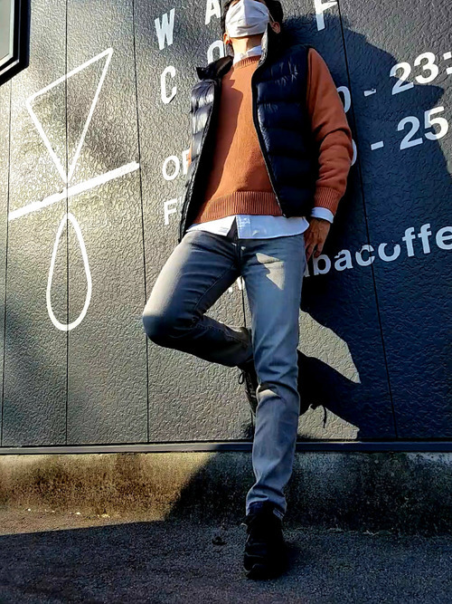 オアスロウの定番デニムパンツと言われる細めなシルエットの107に、ニットとダウンジャケットを合わせたコーデになります。ロールアップしたジーンズに足元のスニーカーでカジュアル感を演出。107は6年履き続けているとのことなので、これからもっと経年劣化による色落ちを楽しめることでしょう。