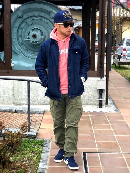 ミリタリー好きにも人気のあるオアスロウ製のカーゴパンツに、カバーオールとパーカーを組み合わせたコーデになります。カバーオールの中に着ているピンクのパーカーが、遊び心のある配色でおしゃれに見えます。デニムジャケットとは違う、長めの丈感が魅力的なコーデだと言えるでしょう。