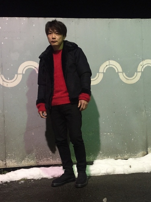 赤いアンゴラニットのセーターに、黒のムートンコートのメンズコーデ。赤一色のセーターでも、黒と合わせるとそこまで派手に感じませんね。パンツと靴も黒で揃えています。見るからに暖かそうな着こなしです。