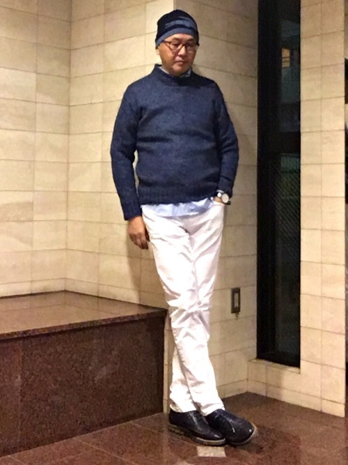 淡いブルーのシャツにブルー系のアンゴラニットセーターを重ね着し、白パンツを合わせたメンズコーデ。青と白で爽やかな大人の休日を演出した着こなし。清潔感を感じられ、アンゴラニットが上品さも上乗せしてくれます。