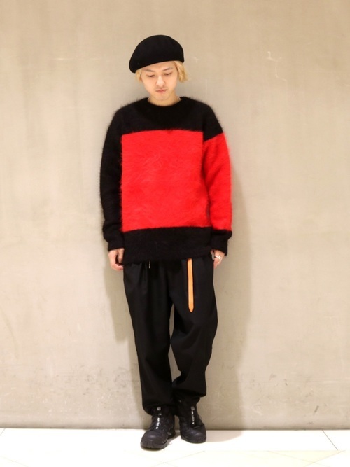 クルーネックのアンゴラニットセーターにワイドパンツのメンズコーデ。赤×黒の配色が目にも鮮やかなコーデです。さりげないベレー帽や垂らしたベルトがこなれ感を出しています。