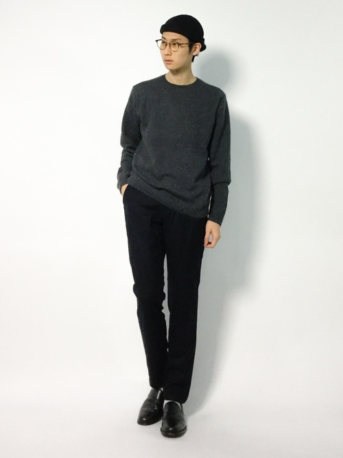 クルーネックのアンゴラニットセーターにストレッチパンツというメンズコーデ。ダークグレーとネイビーの落ち着いた着こなしです。足元はローファーでキレイめな雰囲気にまとめています。