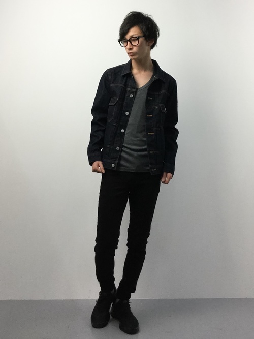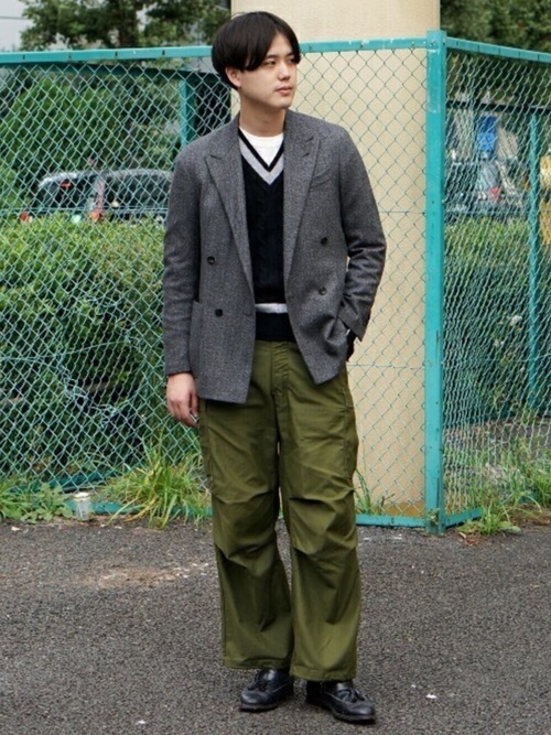 スリードッツのTシャツにニットを合わせ、さらに上からジャケットを羽織っているスタイルです。ゆったりめのパンツを履くことで、カジュアルな雰囲気にまとまっています。
