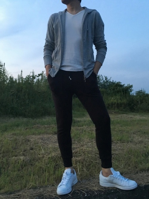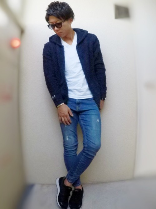 無地のスリードッツTシャツにパーカーを取り入れたコーディネイトです。下はデニムパンツとスニーカーなので、シンプルですがクールな印象に仕上がっています。