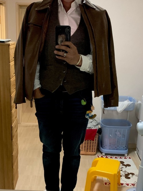 こちらの男性は、白シャツの上にスリードッツのベストを合わせています。一番上にはダークブラウンのアウターを羽織っており、全体的にシックで落ち着いた印象がおしゃれです。