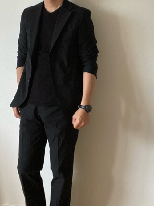 スリードッツのTシャツとセットアップを使い、全身を黒で統一しているコーデです。大人で落ち着いた印象のスタイルは、キレイめコーデが好きな人にぴったりではないでしょうか。