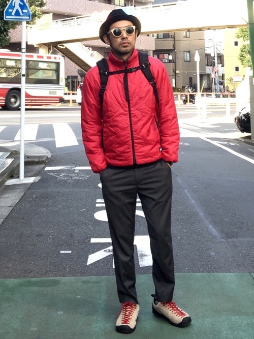 スラックスに、ワイルドシングスのプリマロフトジャケットというメンズコーデになります。ダークグレーと赤のコントラストが、目にも鮮やかなカラーコーディネートです。パンツはほどよいテーパードシルエットで、キレイめな印象もプラスしています。