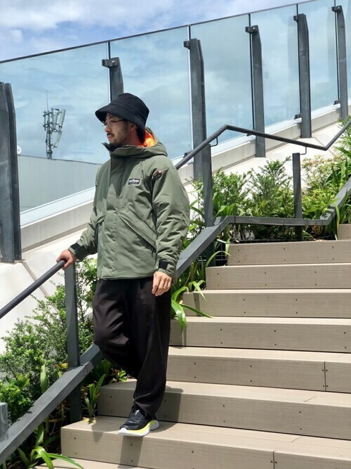 ワイドパンツとワイルドシングスのプリマロフトパーカーのメンズコーデです。オレンジ×カーキのパーカーはミリタリー感も感じさせますが、バケットハットとスニーカーでカジュアルなテイストにまとめています。