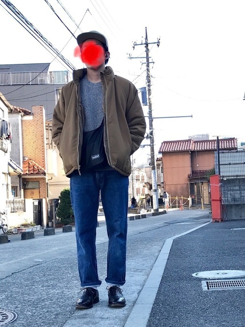 ニットにデニムパンツ、ワイルドシングスのプリマロフトジャケットのコーデです。デニムパンツは余裕のあるサイズ感を選んで、ほどよいリラックス感を感じさせています。また、足元は革靴にしてカチッとした雰囲気もプラスしました。