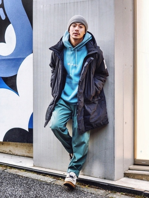 スウェットパーカーにワイルドシングスのプリマロフトパーカーというメンズコーデです。水色とスモーキーグリーンの優しい色合いに、黒いパーカーで引き締め効果を生んでいます。足元は独特のデザインのシューズを選び、個性を出すことも忘れていません。