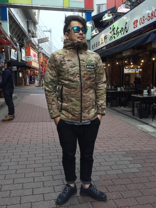 黒のパンツに迷彩柄のプリマロフトジャケットというメンズコーデです。迷彩柄で男らしさを演出しつつ、テーパードシルエットのパンツをロールアップすることで抜け感も出しています。街ではもちろん、アウトドアでも馴染む着こなしに仕上げています。