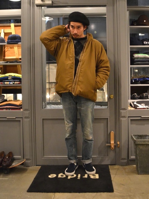 アーガイル柄のニットにデニムパンツ、ワイルドシングスのプリマロフトジャケットというメンズコーデです。デニムとニットの大人の休日スタイルにも、ワイルドシングスのジャケットはよくマッチしています。さりげなくベレー帽を合わせるところもおしゃれポイントです。
