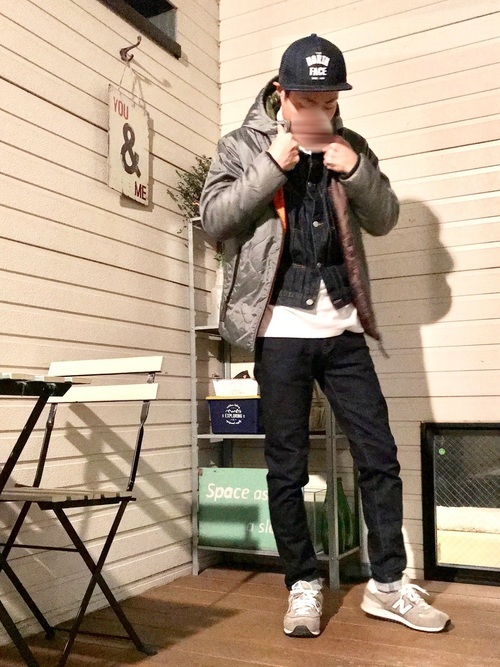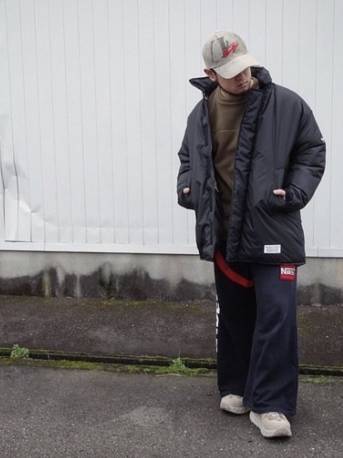 ワイドパンツに、ワイルドシングスのプリマロフトジャケットというメンズコーデです。落ち着いた色合いでまとめており、スニーカーでさりげなく差し色を入れています。キャップでアウトドア感を出しているところもポイントです。