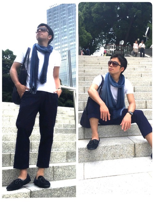 ストールが印象的な秋のマッチョに似合うファッションコーデです。トップスは胸筋をアピールすることができる、VネックのTシャツを合わせています。ストールを巻くことで目線を上に動かし、低身長や下半身のコンプレックスをカバーすることができます。シンプルなコーデにドライビングシューズを合わせることで、季節感や大人っぽさを演出することが可能です。