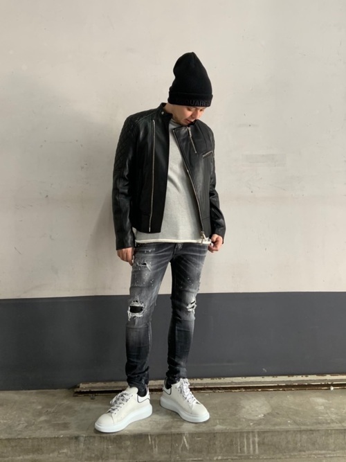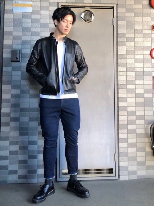 マッチョに似合うファッションアイテムのライダースジャケットを使った服装です。タイトめなアウターで腕や肩周りの筋肉をアピールしつつ、インナーには白のシャツを合わせて爽やかな印象を与えることができます。ライダースとジーンズでカジュアルになりすぎるところを、Dr,Martens (ドクターマーチン)のシューズできれいな大人コーデを完成させています。