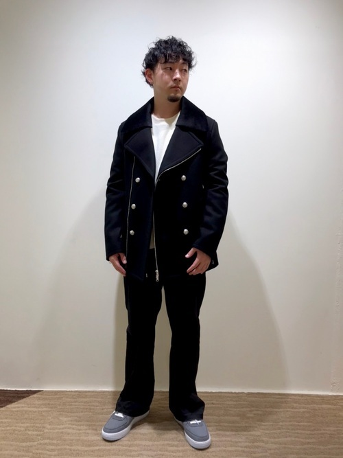 Pコートを使ったマッチョに似合う私服ファッションです。パンツはノータックで流行りのビッグシルエットに対応しており、脚の筋肉が気になる方でもゆったりと着用することができます。インナーにはシャツを合わせて、すっきりとした着こなしになっています。