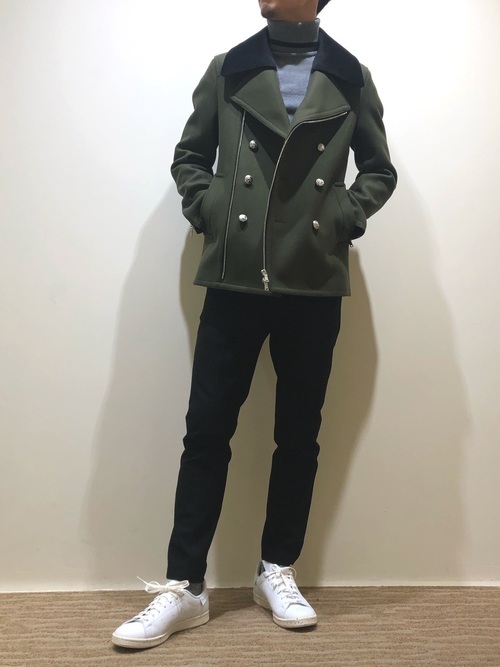 マッチョに似合うPコートとテーパードパンツを合わせた私服ファッションです。タートルネックで冬の寒さでも快適に過ごせる大人カジュアルなコーデですが、レザーシューズではなくスニーカーを合わせることで、抜け感を演出しています。