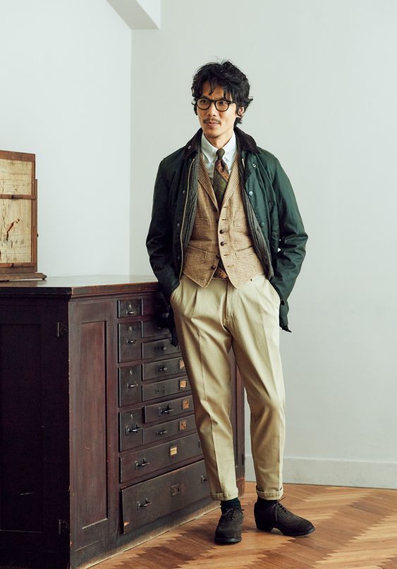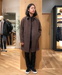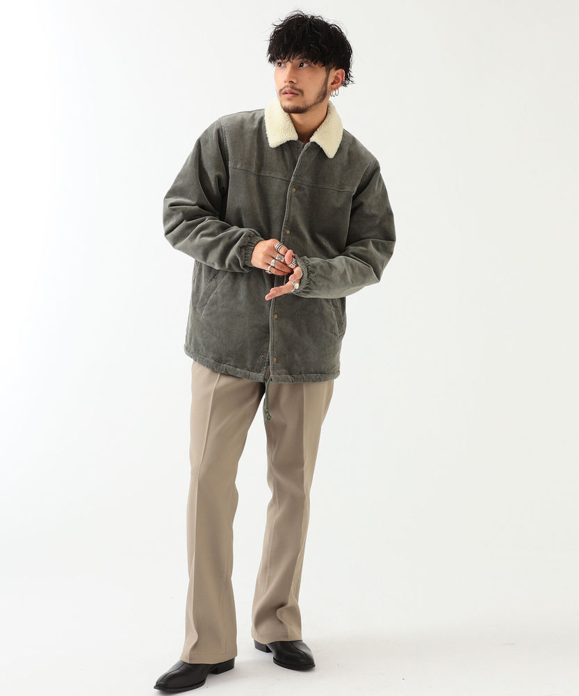 表地はコーデュロイ、裏地はボアを使用している見た目にも温もりがあるジャケットです。同系色のアースカラーのスラックスを合わせて、黒色の靴で全体を引き締めています。ジャケットの襟元の生地がボアになっていて、アクセントになっています。