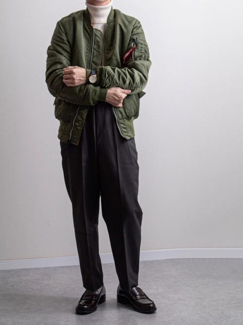 MA-1にダークカラーのパンツとローファーを合わせた、大人っぽいメンズコーデになります。袖元のリブの上から腕時計を巻いているのが、小粋に見えます。インナーにタートルネックセーターを着て、防寒対策もバッチリだと言えましょう。見た目にさほどミリタリーっぽい感じがしない着こなし方なので、お父さん世代にもおすすめです。
