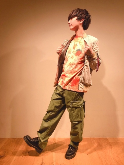 MA-1にカーゴパンツとブーツでミリタリー感あふれるメンズコーデに仕上げながらも、中に着ているタイダイ柄のTシャツが全体のバランスを上手く調和させているのが見て取れます。シンプルな着こなし方なので、インナーを無地TやブランドのロゴTに変えたりすると、これとはまた違った印象に見えることでしょう。