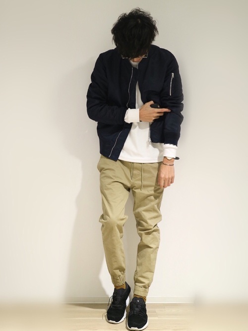 アルファインダストリーズとアーバンリサーチの別注MA-1に、ジョガーパンツを組み合わせたシンプルなメンズコーデですが、全体的に見てカラーコーディネートが上手い着こなし方だと言えます。この配色だとボトムスはチノパンでも良さげですが、細身のジョガーパンツでスポーティーに仕上げているところがおしゃれのポイントです。