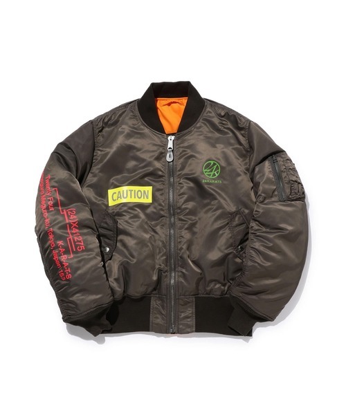 EXILEや三代目J Soul Brothersなどが所属するLDHが手がけるブランド「24karats」と、アルファインダストリーズがコラボした別注MA-1になります。胸元や背中などにあしらわれた24karatsのロゴが、いかにも別注モデルらしい見た目のインパクトが強烈な1着です。