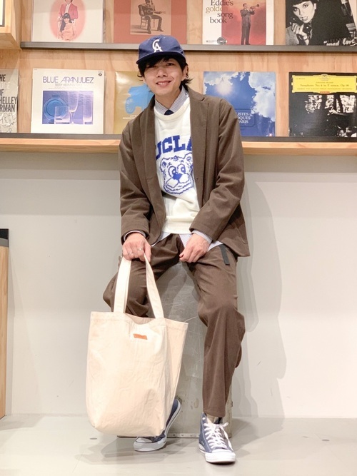 ブラウンのコーデュロイ生地のセットアップを使用したメンズコーデです。ブラウン、ブルー、ホワイトのシンプルな配色で、洗練されたトラッドカジュアルスタイルに仕上がっています。目を引くクマのニットが遊び心のあるアクセントに。ユニバーサルオーバーオールのトートバッグもコーデになじみ、さりげない存在感を発揮しています。