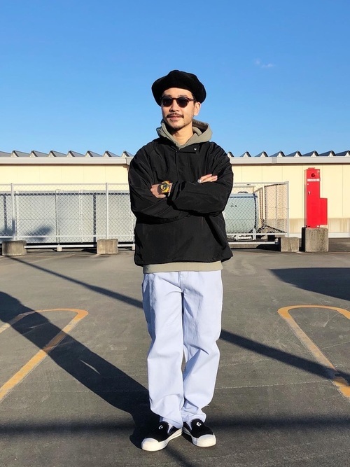 ユニバーサルオーバーオールの、トレンド感たっぷりの緩めシルエットのペインターパンツを使用したメンズコーデです。小物やアウターの黒のクールな印象とパーカーとパンツの春らしいクリーンな柔らかさのバランスが絶妙な着こなしです。