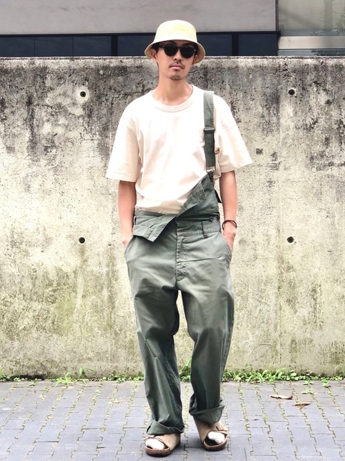 ベージュのTシャツとカーキのサロペットを合わせたナチュラルなストリートスタイルです。ユニバーサルオーバーオールのバケットハットがアクセントに。肩紐外しやサングラスで、こなれ感のあるスタイルに仕上がっています。