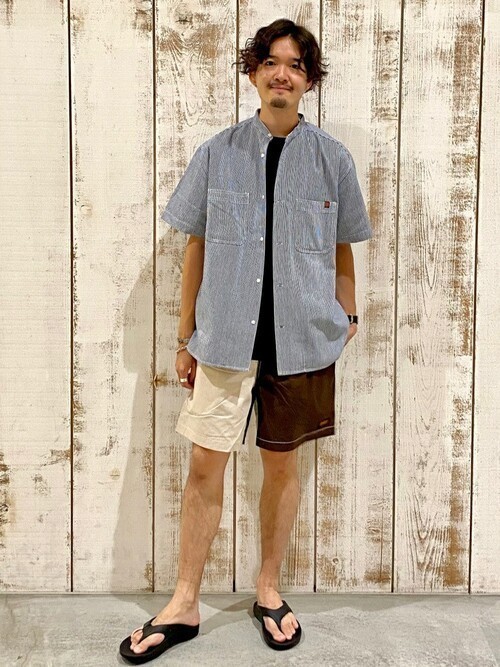 ブルーのさわやかなバンドカラーシャツに黒のTシャツとクレイジーパターンのショーツを合わせたリラックススタイルです。程よくゆったりとしたシルエットでシンプルなバンドカラーシャツに、バイカラーのショーツがアクセントになっています。