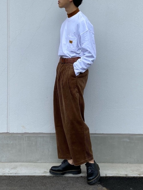 ユニバーサルオーバーオールのロングTシャツを着用したメンズコーデです。ゆったりとしたオーバーサイズのシルエットがこなれたムードをかもし出します。モックネックのTシャツときれいめなコーデュロイパンツを合わせて、シンプルな中にもトレンド感を感じさせる着こなしになっています。胸ポケットとロゴがさりげないアクセントに。
