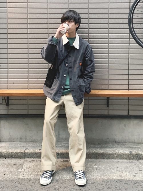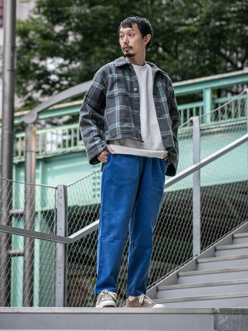 ユニバーサルオーバーオールのカバーオールとスウェットを使用したメンズコーデです。身幅が広いビッグシルエットのカバーオールが旬のスタイルを印象付けています。ショート丈なので、インナーのスウェットとのレイヤードもバランスよくきまっています。ブルーのコーデュロイパンツを合わせて、ウォーム感がありながら軽快な印象の着こなしに。