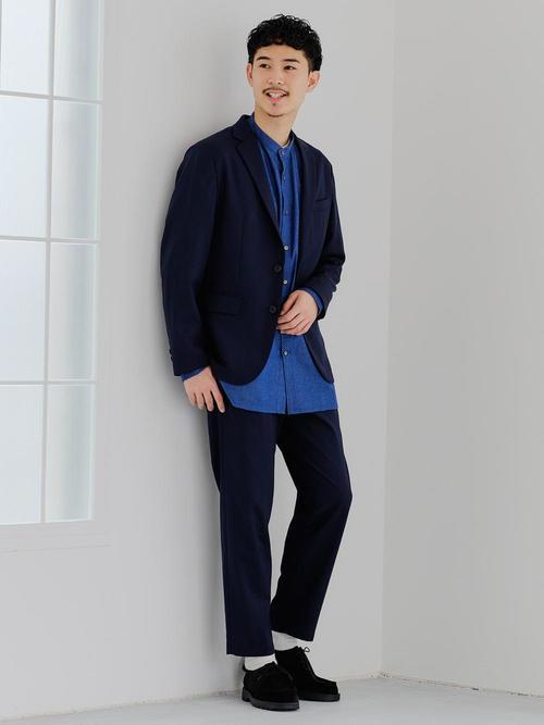 ネイビーバンドカラーシャツ×ネイビーセットアップ