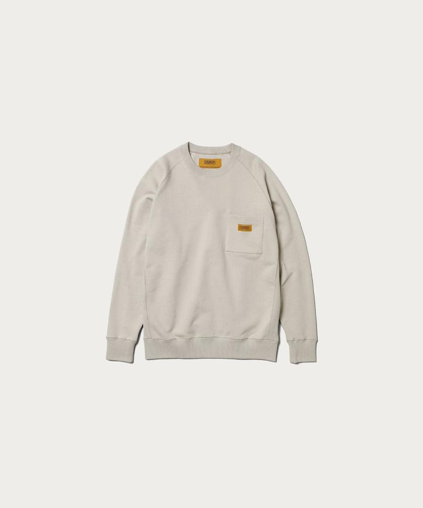 ヘビーオンスの裏毛生地を使用したスウェットです。実用性とデザイン性を兼ねた胸ポケットと、マットゴールドのタグがアクセントになっています。身頃の両サイドをリブ編みにして、着心地にも配慮しています。クリーンなホワイトと、ワークブランドらしい適度な色落ちのダークグレーとベージュの3色展開です。