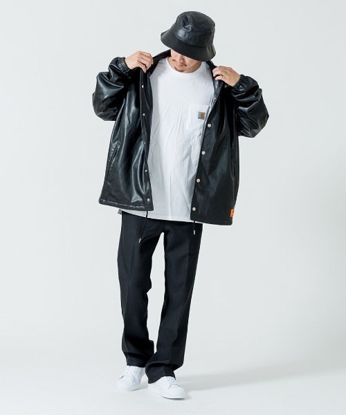 ユニバーサルオーバーオールのレオパード柄シェフパンツを黒でまとめたクールなストリートスタイルです。バケットハットで、さらにこなれ感のあるシルエットに。サンダルとソックスで抜け感のある足元になっています。